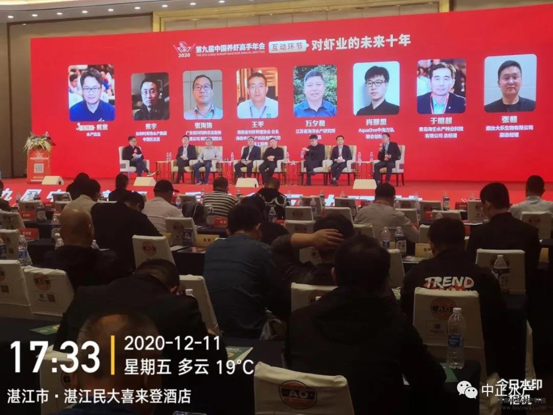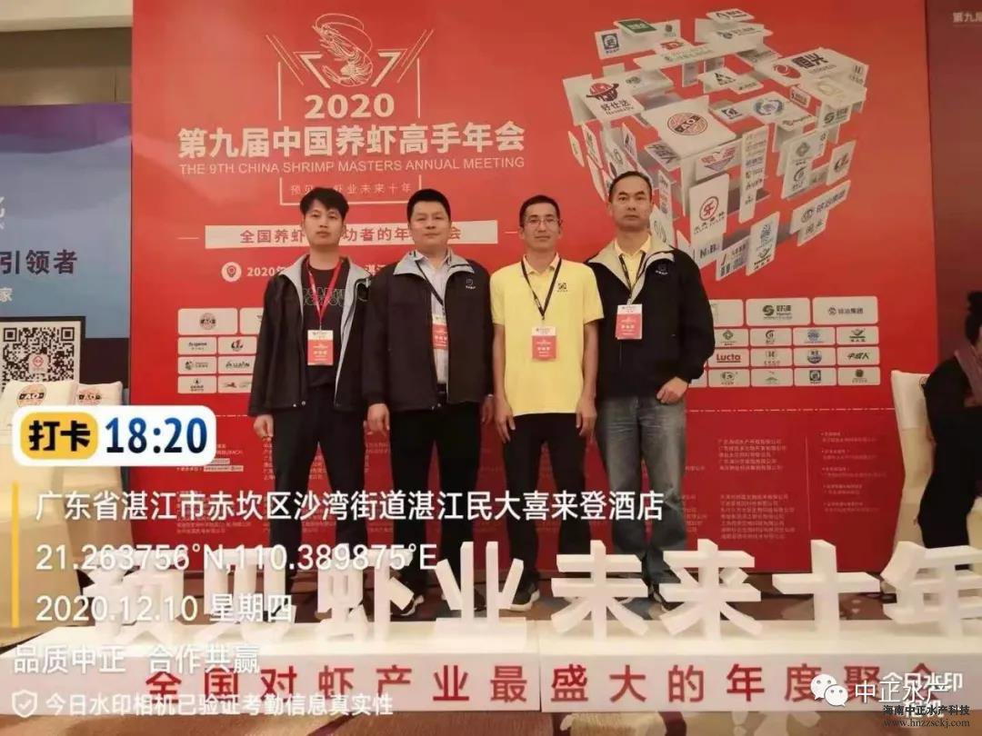 2020年12月10-11日,“第九屆中國養蝦高手年會”在廣東湛江舉行。本屆年會以“預見蝦業未來十年”為主題,以講座報告、提問答疑互動的方式進行,探討的內容包括:對蝦育種育苗技術、對蝦養殖模式、新形式下的對蝦流通、蝦料配方、蝦病檢測手段、生物安保、新型養殖設備等若干問題,吸引了對蝦產業鏈中包括種苗、飼料、動保、設備、流通、消費等利益相關者逾1000人參加。海南中正水產科技有限公司由副總裁王平帶隊,中正水產中山基地負責人羅崗等5人組成的中正水產團隊參加了此屆年會。