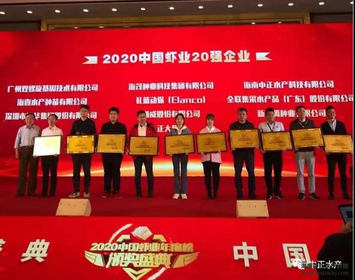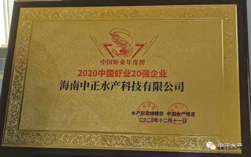 海南中正水產科技有限公司被評為“2020中國蝦業20強企業”