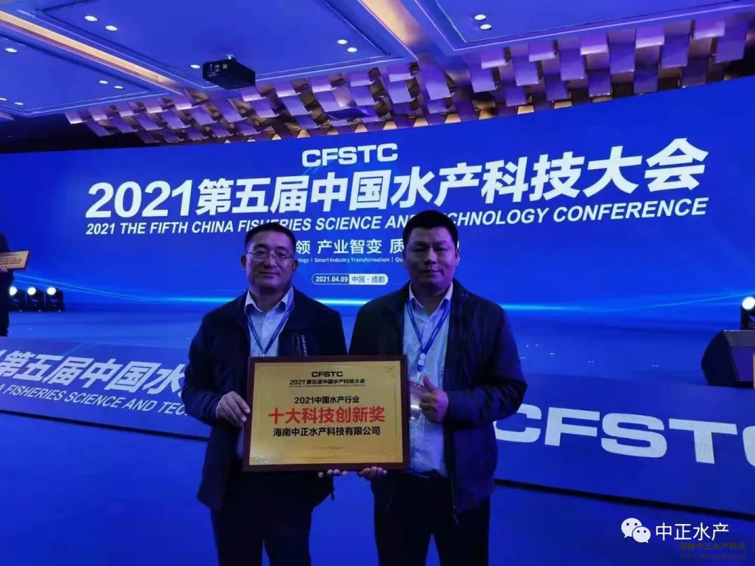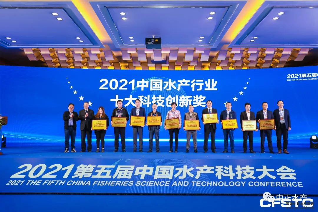 在“2021中國水產科技大會頒獎盛典”上,由水產權威機構與企業代表組成的評委團,根據科技創新、行業貢獻等方面進行綜合評比,最終評選并現場頒發了“2021中國水產行業·十大科技創新獎”、“2021中國水產行業·十大杰出成果獎”、“2021中國水產行業·十大卓越貢獻獎”等重磅獎項,中正水產榮獲“十大科技創新獎”。